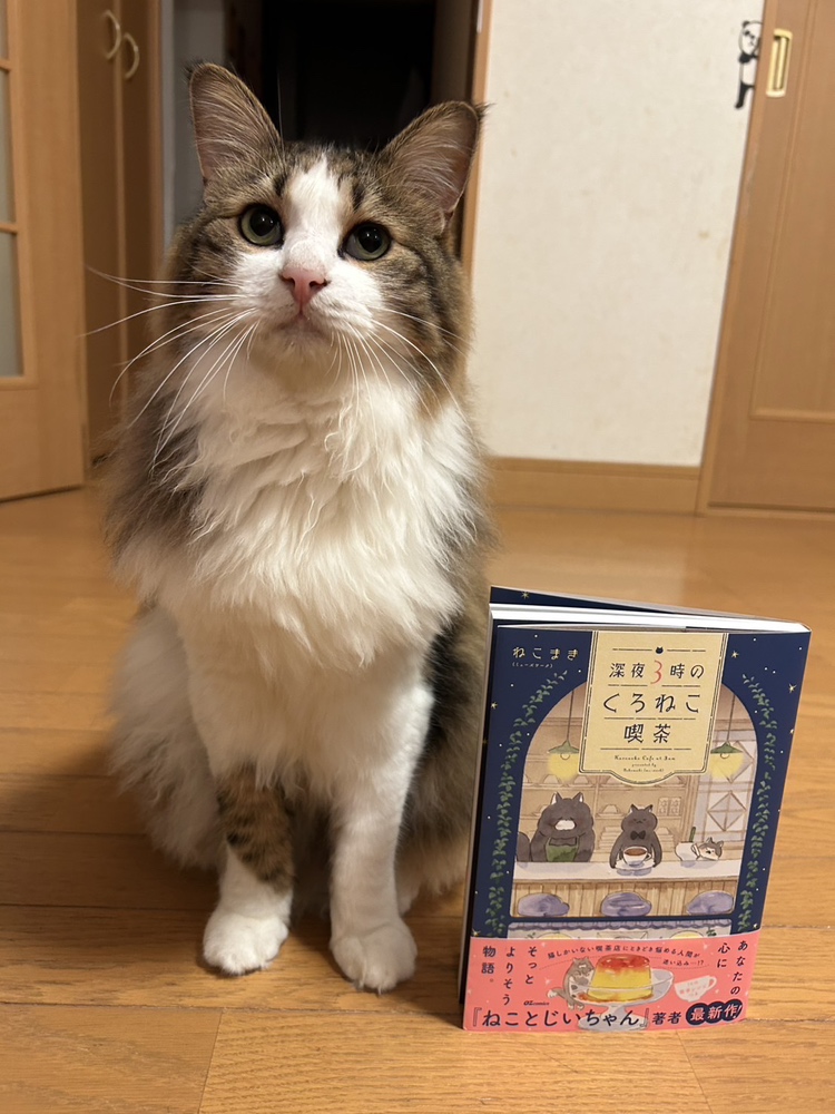 購入した対象商品『深夜3時のくろねこ喫茶』の表紙と、あなたの猫ちゃんの2ショットをXで投稿!